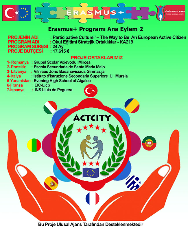 Projenin konusu : Öğrencilerin ihtiyaç duyduğu bilgilerin farkına varmasını sağlamak amaçlanmıştır. Bu bağlamda, Avrupa topluluğuna mensup bilincini kazanacak öğrenciler, katılımcı kültürünün gelişmesine Avrupa vatandaşlar olarak hakları ve görevleri ile ilgili bilgilerini arttırmaya katkıda bulunmayı amaçlanmaktadır. Bu arada aktif vatandaşlık ihtiyacı konusunda farkındalığı arttırmak esastır. Kişisel yaşam çıkarları sivil davranışları ile uyumlu olmalıdır. Gençlerin yaşadıkları topluma ait duyguları Yeniden Canlandırmak modern bir yaklaşım sergilemek projenin amaçları arasındadır. Bu proje 2 yıl süreli olup . 8 ülkeden katılımcılar yukarıda belirtilen amaçlara katkıda bulunmaya çalışacaklardır.
